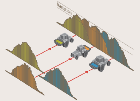 Une fois que l’on a enregistré la nappe d’épandage d’un engrais et d’un épandeur donnés, l’ordinateur superpose ces nappes en simulant l’avancement du tracteur (figure ci-dessous) [2] :