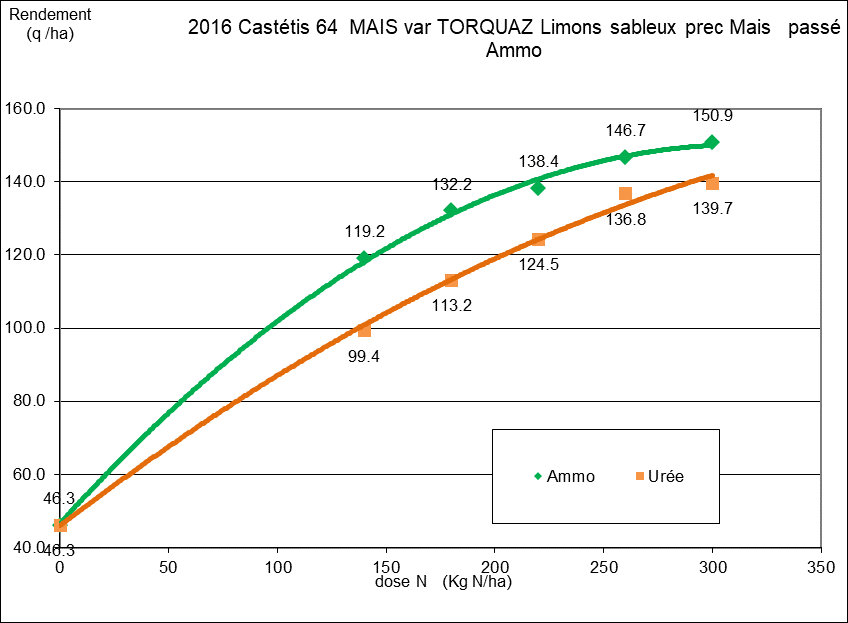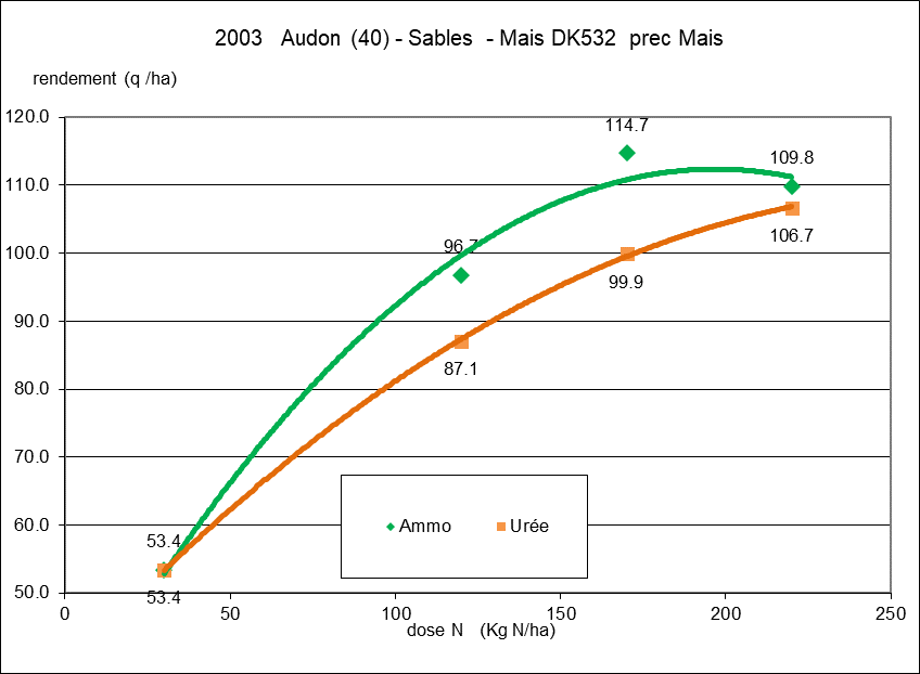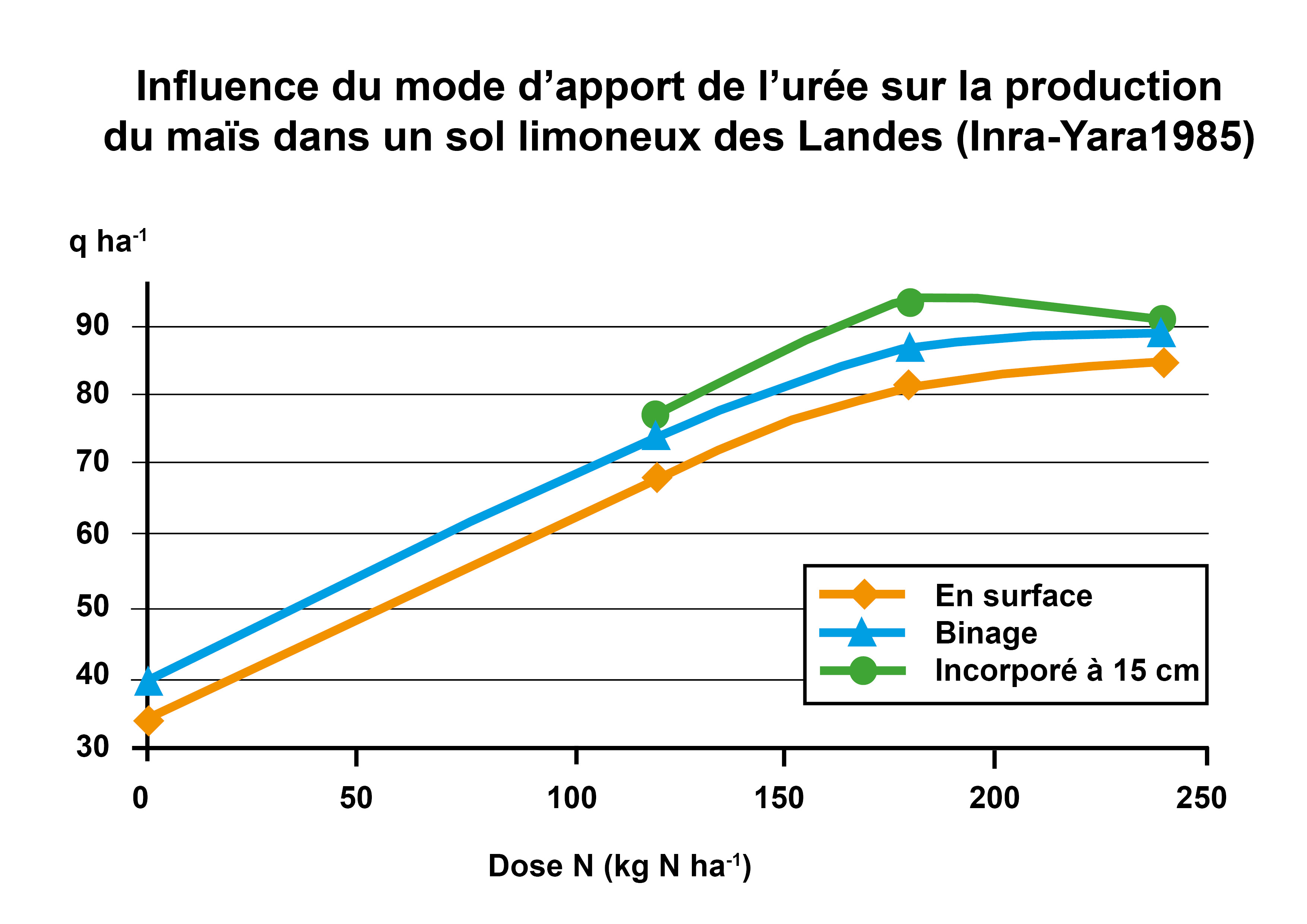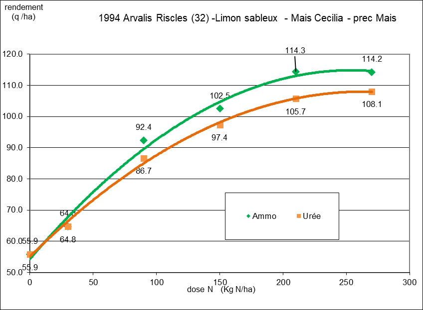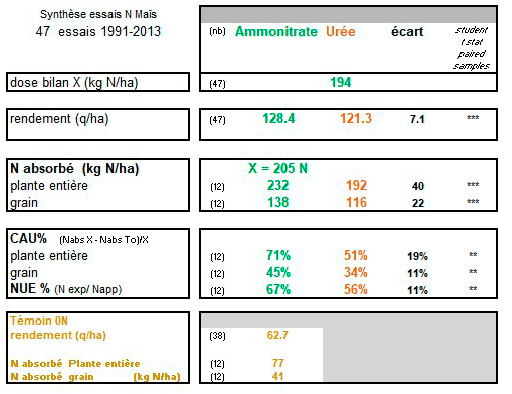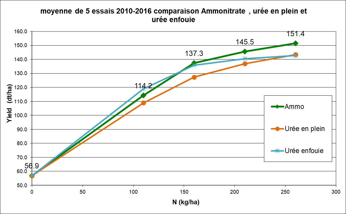 Depuis cette époque, des essais comparatifs entre ces deux formes d’azote ont été conduits régulièrement avec des modalités différentes pour établir les meilleures recommandations possibles : doses, stade d’apport, technique d’apport (en plein ou enfoui), conditions pédoclimatiques...Et depuis 30 ans, la conclusion reste la même : on obtient de meilleurs rendements en maïs avec l’ammonitrate qu’avec l’urée (Figure 2).