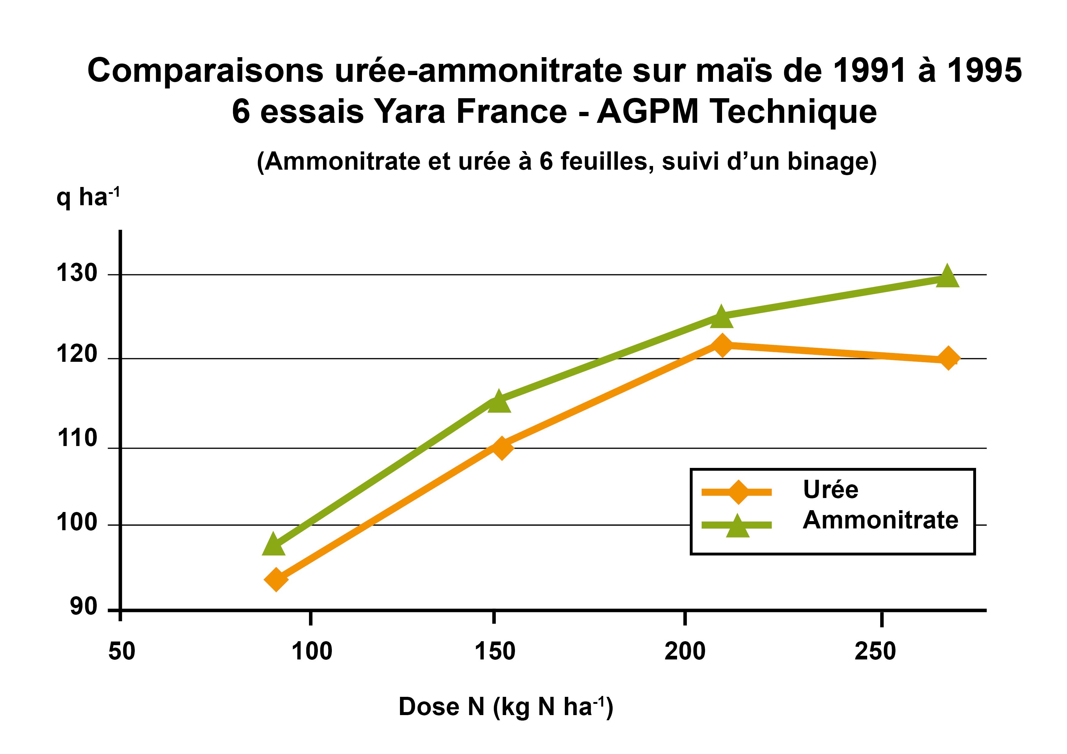 Voici la synthèse de 6 essais lancés à partir de 1991 par Yara, sous son ancien nom d’Hydro Agri France en collaboration avec AGPM technique1 qui n’avait pas encore rejoint Arvalis (Figure 1). Déjà, on comparait l’efficacité de l’ammonitrate sur maïs par rapport à l’urée et déjà, l’ammonitrate montrait sa supériorité avec des rendements supérieurs.