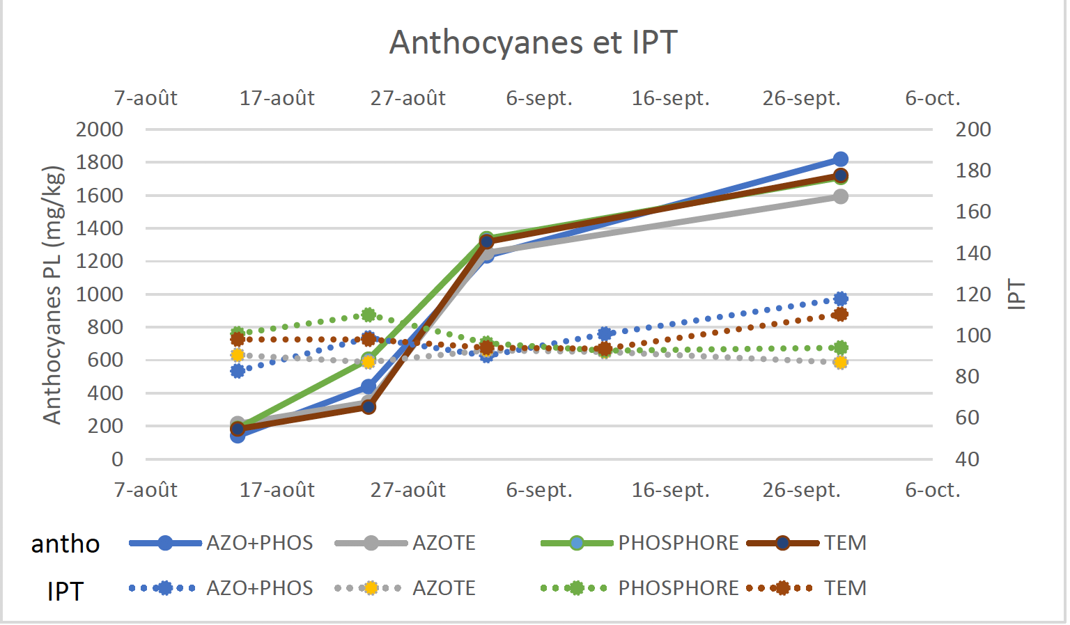Pour le merlot, on n’observe aucun d’effet mais un niveau d’anthocyanes faible, suggérant une dilution liée aux pluies au cours de la maturation (86 mm pour le mois d’août).