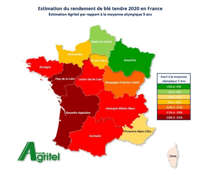 Agreste a estimé début août la récolte de blé tendre 2020 à 29,7 millions de tonnes, avec des surfaces de 4,34 millions d’hectares et un rendement moyen de 6.83 T/Ha. Toutefois, derrière ce rendement moyen se cache d’importantes hétérogénéités, comme le présente la carte ci-dessous publiée par Agritel, qui reflètent la disparité des situations rencontrées en cours de saison comme décrit précédemment.