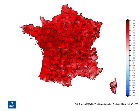 Nous avons connu notre début d’année 2020 le plus chaud jamais observé, après celui de 2011, avec +1,7°C par rapport à la normal sur janvier à mai, comme l’avais indiqué La Chaine Météo. L’ensoleillement a été relativement exceptionnel, de plus de 30 % au nord de la Loire et de près de 50 % près des frontières avec la Belgique.