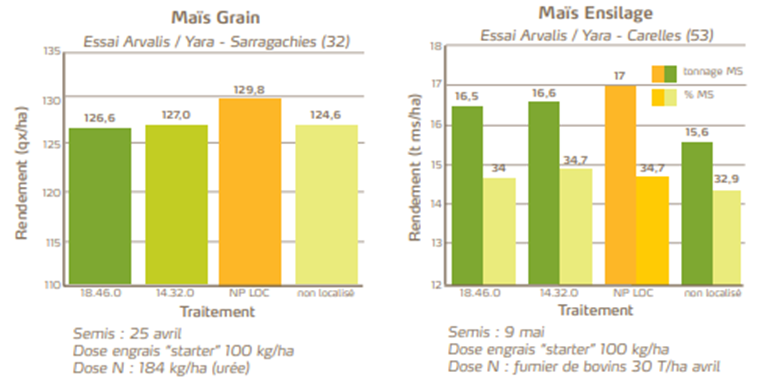 Les essais menés par Arvalis/Yara ont montré que la localisation d’un engrais de la gamme YaraMila® NP Loc apporte en moyenne des gains de rendement de plus de 5 q/ha en maïs grain, et de 1,4 t de matière sèche/ha en maïs fourrage, grâce à un enracinement plus rapide et plus dense.