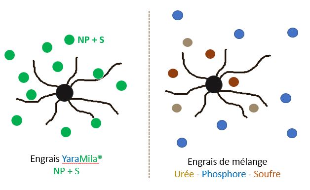 2) qui combine l’ensemble de ces éléments dans un même granulé pour une répartition parfaite au champ (sans risque de ségrégation des éléments dans la trémie de l’épandeur, au cours du transport et à l’épandage) et une meilleure accessibilité des éléments par les racines dans le sol ;