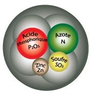 1) qui apporte l’ensemble des nutriments nécessaires au bon démarrage de la culture, à savoir : de l’azote nitrique et du phosphore soluble immédiatement assimilable, de l’azote ammoniacal pour une action prolongée, du soufre pour favoriser l’absorption de l’azote et du zinc pour pallier les carences en cet élément fréquentes sur maïs ;