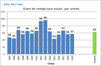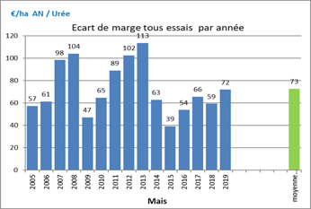 La mise en œuvre de ces techniques de réduction s’accompagnant d’un coût supporté par les agriculteurs (de l’ordre de +20% pour l’unité d’azote d’ammonitrate par rapport à celle d’urée), le groupe de travail ADA de l’UNIFA s’est intéressé récemment à l’impact de la forme d’azote sur le revenu des exploitations. Dans cette étude technico-économique[4], ce sont 15 années de prix des engrais et des cultures qui ont été rapprochées de 220 résultats d’essais comparant ammonitrate et urée pour simuler 3300 situations sur 4 grandes cultures : colza, blé tendre, orge d’hiver et maïs grain. Bien que les prix actuels n’aient jamais été rencontrés sur la période 2005-2019, y compris en 2008-2009, cette étude constitue une démonstration particulièrement robuste et représentative du marché français.
