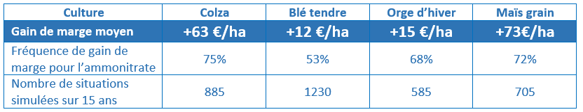 Le gain de marge sur céréales à paille, s’il n’est significatif que 10 années sur les 15 étudiées, reste néanmoins en faveur de l’ammonitrate : +12 €/ha sur blé tendre et +15 €/ha sur orge d’hiver en moyenne sur 15 ans. Qu’en est-il finalement de la rentabilité économique des ammonitrates dans le temps ? Combiné aux excellentes performances montrées sur colza et maïs grain, il en résulte en moyenne un gain de marge de +30 €/ha/an pour une rotation colza-blé-orge et +33 €/ha pour une rotation maïs-blé-orge.