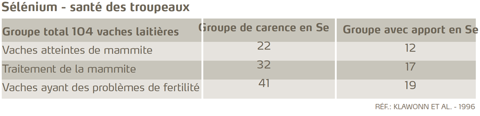 Ce que l’on sait : le sélénium participe à la préservation de l’intégrité des globules blancs essentiels à l’élimination des infections mammaires ; une carence en sélénium diminue la capacité bactéricide du système immunitaire (Grasso 1990 et Hogan 1990) et limite la migration des globules blancs vers les sites infectieux**.