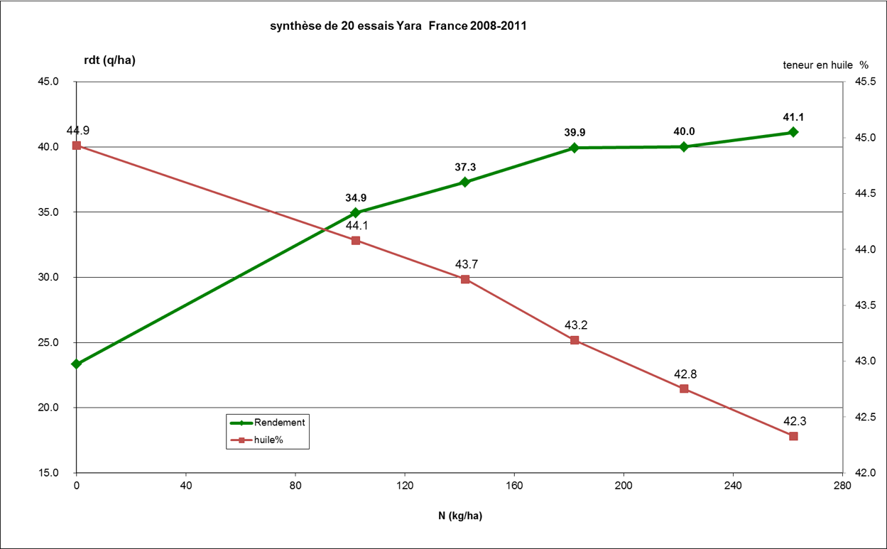 teneur en huile et dose N : un excès d’azote de + 50 N/ha se traduit par une chute de teneur d’environ 0.5 point d’ huile. Néanmoins du point de vue de la production d’huile par ha, il convient de situer à la dose optimale pour le rendement pour une production d’huile maximale.