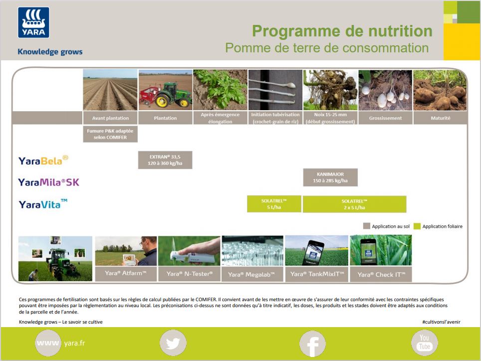 La stratégie YaraMila® SK KANIMAJOR assure un apport de potassium et d'azote sous une forme rapidement soluble et facilement assimilable ; elle est particulièrement adaptée pour un épandage entre les rangs pendant la croissance des tubercules. La faible teneur en chlore (contrairement au chlorure de potassium) limite les effets négatifs sur la teneur en matière sèche du tubercule et la qualité de la peau, 2 critères qualité très recherchés en pomme de terre consommation (respectivement pour la qualité à la cuisson et l'aspect des tubercules).