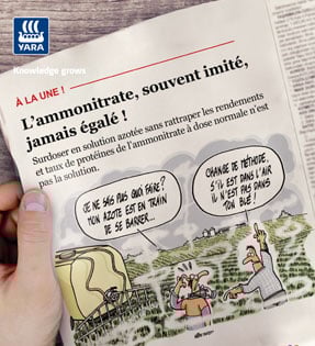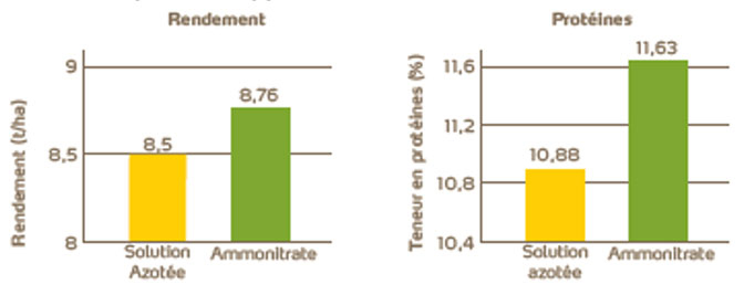 Depuis plus d’une trentaine d’années, divers organismes tels que Yara, Arvalis ou la distribution agricole ont incontestablement démontré la meilleure efficacité des ammonitrates comparativement à la solution azotée. Sur blé tendre, les dernières communications d’Arvalis établissent une perte de rendement moyenne de 4.3 q/ha et 0.6 pt de protéines en moins pour une même dose d’azote apportée. Les experts internationaux (EMEP 2013 , EMEP 2016) ont également démontré la plus forte volatilisation ammoniacale au dépens de la solution azotée comparée aux ammonitrates. En moyenne, environ 8 à 10% de perte d’azote sous forme d’ammoniac avec la solution azotée contre seulement 1 à 3% avec les ammonitrates.