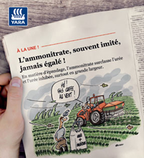 Lors des tests d’épandage en condition contrôlées, les ammonitrates Yara permettent régulièrement d’atteindre des largeurs de travail de 45 à 50m avec des coefficients de variation restant en dessous de 10% tandis que les urées granulées ne dépassent pas 36m. Transposées au champ en conditions réelles : présence de vent, sol irrégulier, ornières, ces performances se dégradent nécessairement mais avec les ammonitrates, une marge de sécurité importante existe pour obtenir un épandage régulier. Un épandage de précis améliore la marge économique et réduit l’impact environnemental. Des engrais de qualité et d’origine connue garantissent une bonne épandabilité et un apport uniforme des éléments minéraux. Lorsqu’il s’agit d’épandabilité, tous les types d’engrais ne se valent pas. L’ammonitrate, grâce à sa densité apparente plus élevée, présente de meilleures caractéristiques d’épandage que l’urée. Le vent peut lui aussi nuire à la régularité de l’épandage notamment de l’urée, moins dense que l’ammonitrate, est beaucoup plus sensible à ce facteur aboutissant souvent à une alternance de zones sur ou sous fertilisées à chaque passage et à des mauvais recouvrements des nappes d’épandage. Du point de vue de l’épandage, les urées inhibées si elles compensent une bonne partie des inconvénients reconnues de l’urée : plus grande sensibilité à la volatilisation ammoniacale et moindre efficacité agronomique, présentent les mêmes inconvénients que l’urée : densité identique, sensibilité au vent et à la reprise d’humidité, moindre portée d’épandage.