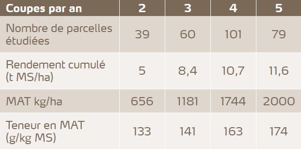 Rendement matière sèche (MS) et Matières Azotées Totales (MAT) et teneur en MAT pour différents modes d’exploitations dans le sud de l’Allemagne (essais de 2009 à 2012).