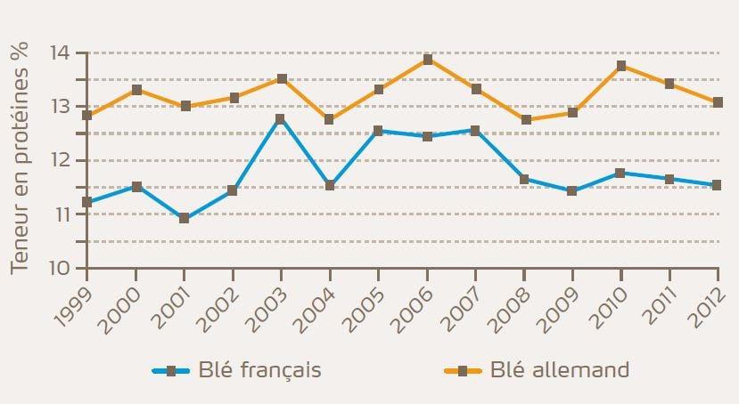 L'évolution des teneurs en protéines du blé dans les 2 pays révèlent un écart significatif.