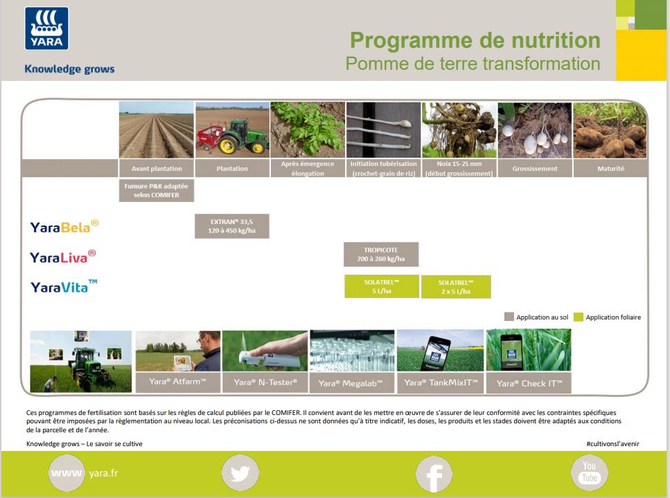 Entre les stades initiation tubérisation et début grossissement, apportez 5 L/ha de YaraVita™ Solatrel™ en pulvérisation foliaire dans un volume d'eau de 200 L/ha (pour un total de 15L/ha en 3 passages) pour prévenir les carences et ainsi soutenir des objectifs de rendement et de qualité élevés.